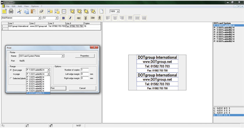 It is the software solution for the printing of any type of label from the DOTgroup Cable Marker and Core Ident range. DOTlabel Software includes various import functions to optimise your marking procedures, enabling the easy transfer of the necessary data directly from Word or Excel into pre-installed templates. Manual entry of the data is considerably simplified by the automatic numbering function, which permits convenient, easy production of labels, consecutive numbers or repetitive sequences. DOTlabel Software features & benefits • Pre-installed templates for entire range of DOTgroup Cable Markers • & Core Idents • Copy and paste complete projects direct from Excel or Word • Manually type individual labels straight into DOTlabel Software • Quantities generator - simply add number of labels required for • each individual label • Page-by-Page preview prior to printing • Simple font formatting • Print individual pages or complete project • Options for advance formatting • Easy to use minimal training required • Clear layout working left to right of PC screen • Ability to import and print Company logo’s • WYSIWYG - What you see is what you get! Contact us to receive your copy of DOTlabel software ![]() ![]() |