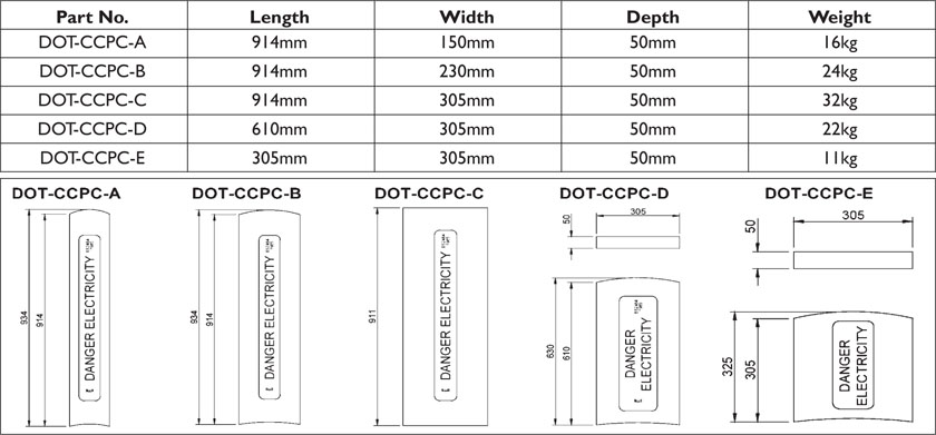 DOT Concrete Cable Protection Covers, also known as Cable Route Markers, are used frequently by utility companies to provide a clear indication to site staff who may be working close to underground electrical cables. Covers act as a protective barrier against damage to buried electricity cables eliminating the risk of accidents and costly repairs. They can also be used to locate and identify other underground services. The DOT Concrete Cable Protection Covers are reinforced precast concrete units manufactured and tested to BS2484 specifications. The covers are imprinted, as standard, with the words ‘DANGER ELECTRICITY’ and are available in five standard sizes shown below. On request, bespoke covers can be manufactured to order for other services such as Gas, Oil, Chemicals, Water, Propane Line, Fibre-Optic Cable, Telephone etc., please contact us for further information. |