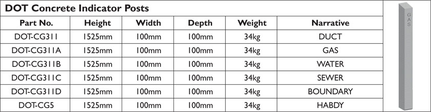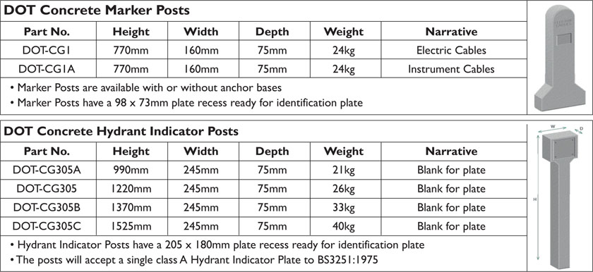 The range of precast DOT Concrete Indicator Posts are widely used by utility companies and are installed to assist the location and identification of underground services. They are made from reinforced precast concrete, manufactured and tested to BS1881 standards and are available in a variety of types and sizes, details of which are shown in the tables below. Any other requirements can be made to order. ![]() ![]() |
