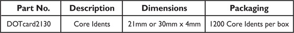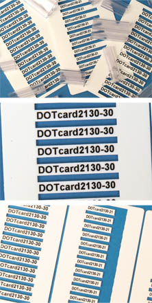 Product Overview The DOTcard2130 two-part sleeve and core ident system is probably the most popular way of identifying instrumentation wiring across the world today. The system is made up of a transparent sleeve, the DOTsleeve, which has one recess for the wire / cable and one recess for the DOTcard2130 core ident. No more having to disconnect, reconnect and retest the circuit to change a heatshrink label or other type of marker, simply slide the old label out of the DOTsleeve then slide the new label in. The DOTcard System can print up to 7,200 of the DOTcard2130 core idents per hour and uses the same thermal transfer DOTcard System Printer and DOTlabel Software as which prints the full range of DOT cable markers. The software enables you to import information direct from Word and Excel, saving enormous amounts of labour time and money in reduced production times. The DOTcard2130 core identification system has numerous features and benefits such as: • Thermal printer producing up to 7,200 core idents per hour • Easy to use DOTlabel Software, which can import information direct from Word & Excel • Easy to install ‘slide in and break off’ DOTcard2130 and DOTsleeve system • Clear, easy to read text or numbers, even on small cores • No heat gun required • Label can be changed even after termination • The DOTcard2130 core idents are ex-stock and available for immediate despatch. Technical Data