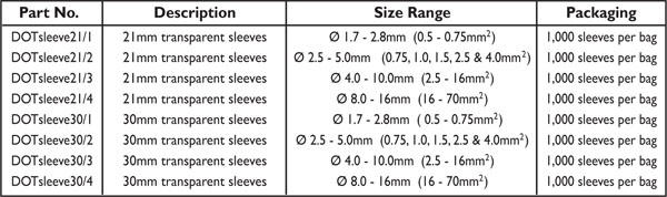 ![]() DOTsleeve21 or DOTsleeve30 Transparent Sleeves Product Overview The transparent DOTsleeve has two recesses, one for the wire / cable and one for the label. The DOTcard2130 core identification system has two distinct advantages over other systems available on the market today. The first being that should the core ident require changing after the wire has been connected, simply slide the old label out before sliding the new one in. There’s no need to disconnect, reconnect and retest the circuit. The second advantage is that should the information to be printed onto the DOTcard2130 core idents not be available at the time the Engineers are ready to connect the wires and test the circuit, the Engineers can simply slide the DOTsleeves into place, connect the wires and test the circuit and the printed core ident can be slid into the DOTsleeve as and when the information becomes available. This cannot be done if a heatshrink labelling system is being used. Both the DOTsleeve21 and the DOTsleeve30 are available in a range of core diameters (see table below) and are manufactured from a flexible PVC for ease of installation. All sizes of the DOTsleeves are ex-stock and available for immediate despatch. ![]() ![]() ![]() |