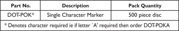 DOT-POK Manual Cable Markers • Oval combination marker used for cable and wire marking applications • For larger diameters the DOT-POK Cable Markers are used in conjunction with the DOT-POH & DOT-PKH • carrier strips, enabling any size of cable or pipe to be marked. • Specially designed oval profile eases installation & means the marker maintains its position when fitted. • Designed to interlock when fitted enabling easy alignment of multiple character markings. • Suitable for cable diameters up to 7.0mm (cable size 4.0 - 6.0mm2)