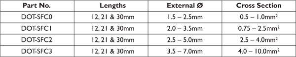 The DOT Slim Fix Clip (DOT-SFC) unites the optimal combination of a secure fit and high flexibility during the marking process. The unique clip mechanism offers the security of a closed marker and the rapid fitting of an open marker in one. DOT Slim Fix Clip is available in four different sizes and in 12mm, 21mm and 30mm lengths. Very long number combinations are possible, depending on the tag length. The DOT-SFC - Slim Fix Clips features and benefits: • Halogen-free material with flammability rating V2 • Slim marker with compensating device for secure fitting • Clip mechanism enables secure fitting even after the cable is connected • Rapid fitting without the use of additional tools • Four sizes for wire cross-sections from 0.5mm2 to 10.0mm2 • Available in 12mm, 21mm and 30mm lengths • Temperature range -40˚C to +100˚C • Additional marking space for exact project allocation • Pre-Printed DOT-SFC Slim Fix Clip markers available on request, laser-printed according • to individual requirements ![]() ![]() ![]()