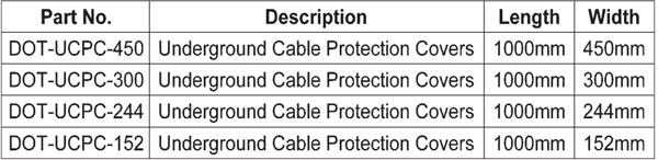 Manufactured from high impact, recycled polyethylene, DOT Underground Cable Protection Covers have been specifically designed to withstand damage from plant and tools. Each electric cable cover provides a highly visible and durable warning against accidental damage from third parties. DOT-UCPC provide high visibility, ease of installation and ability to resist both hand tools and mechanical plant and are the product of choice for utility protection applications, particularly for high voltage cables. While offering a high level of durability and impact resistance, the plastic cable covers are light in weight and exceptionally easy to handle and install. They are fully jointed, laid overlap and held firm with plastic pegs to ensure continuous protection. DOT-UCPC features & benefits: • Impact resistant - doesn’t shatter on impact • Provides clear visual warning to third parties when uncovered • Custom made in different colours and sizes (subject to MOQ) • Custom made in dual language (subject to MOQ) • Custom made with company name and logo (subject to MOQ) • Fully jointed to provide unbroken protection • Contains bold warning text for clear identification • Lightweight - easy to transport, carry and install • Rot proof and resistant to wide range of soil conditions Standards & Approvals: • Impact protection to BS2484, 1985, Part 4 Appendix A • ENA-TS 12-23, Issue 3 2013 • National Grid TS 3.05.07 Issue 6 2011 Appendix A • Approved & specified by utility companies worldwide ![]() Subject to minimum order quantities DOT Underground Cable Protection Covers can be custom made in different colours, sizes, printed with a company name & logo and in either an alternative language to English or even dual language. Please contact us for further information. ![]() |