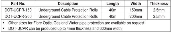 The DOT Underground Cable Protection Rolls are manufactured from high impact recycled polyethylene and is a flexible product supplied on rolls for quick and easy installation. Suitable for low voltage, 11Kv, street lighting, telecoms / fibre optics, gas pipe and water piping. The DOT-UCPR provides a high level of durability and protection to buried utilities, is extremely cost-effective in use and is designed to provide a clear visual warning when uncovered. DOT Underground Cable Protection Rolls features & benefits: • Provides clear visual warning to third parties when uncovered • Custom made in different colours and sizes (subject to MOQ) • Custom made in dual language (subject to MOQ) • Custom made with company name and logo (subject to MOQ) • Flexible, lightweight and easy to install irrespective of weather conditions • Durable with good impact resistance • Rot proof and resistant to wide range of soil conditions • Extremely cost effective in use • Approved & used by utility companies throughout the world • Approved to ENA-TS 12-23, Issue 3 2013 & National Grid TS3.05.07 Issue 6 2011 Appendix A standards Applications of DOT Underground Cable Protection Rolls: • Electric: Red/Brown background with yellow tape/black lettering • Fibre Optic: Green background with black lettering • Gas: Yellow background with black lettering • Water: Blue background with black lettering ![]() Subject to minimum order quantities DOT Underground Cable Protection Rolls can be custom made in different colours, sizes, printed with a company name & logo and in either an alternative language to English or even dual language. Please contact us for further information. ![]() ![]() |
