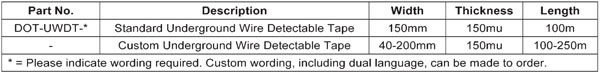 The DOT Underground Wire Detectable Tape is a plastic warning tape with a twin stainless steel tracer wire system designed to mark, locate and help protect underground utility lines. The two wires are laminated within the tape in a continuous ‘wave’ pattern that allows them to stretch by over 25%, which helps compensate for underground movement. The DOT-UWDT is self-coloured and overprinted with a warning message and a ‘scratch-resistant’ layer of transparent plastic which covers the printing. The tape serves the dual purpose of allowing location from above ground as well as providing a visual warning to prevent third party damage. DOT Underground Wire Detectable Tape features & benefits: • Two tracer wires rather than a single tracer double the detection ability • Wavy wires - allows the wires to stretch by 25% - helps compensate for underground movement • Easy to join - no tapes, staples, scratching off insulation etc electrical continuity is • maintained by simply twisting the wires together. A more secure method is to use the • DOT-UWDT-CT Crimping Tool and DOT-UWDT-JC100 Joining Crimps. • Scratch proof surface maintains the legibility of the printing warning message • PVC Free ![]() ![]() DOT Underground Wire Detectable Tape Crimping Tool & Joining Crimps Simply twist the wires together to maintain electrical continuity or for a more secure join, crimp the two wires using the DOT-UWDT-CT Crimping Tool and DOT-UWDT-JC100 Joining Crimps. ![]() ![]() ![]() |